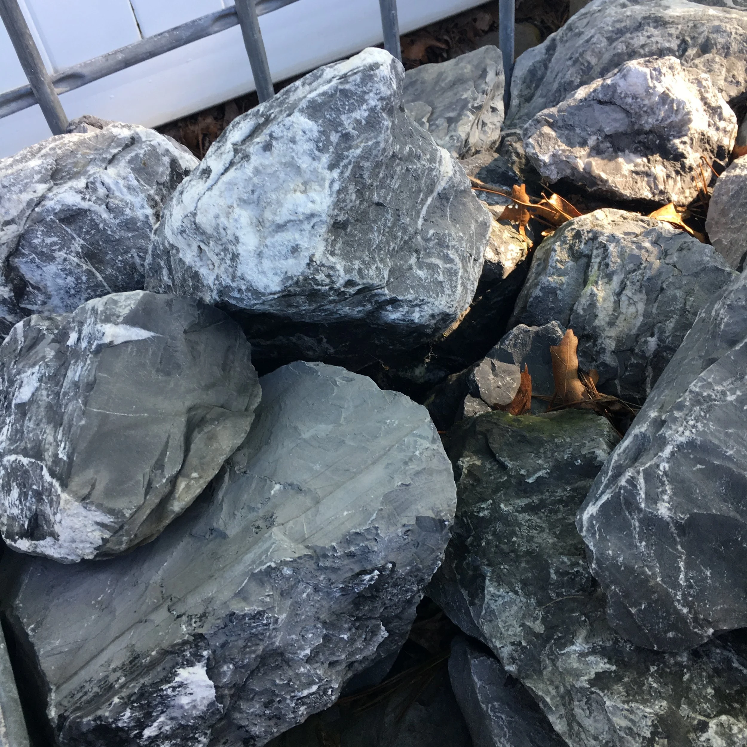 Zebra Rock Natural grey stone with white veins. Great for landscaping, accents and rock gardens. Available by the pound.