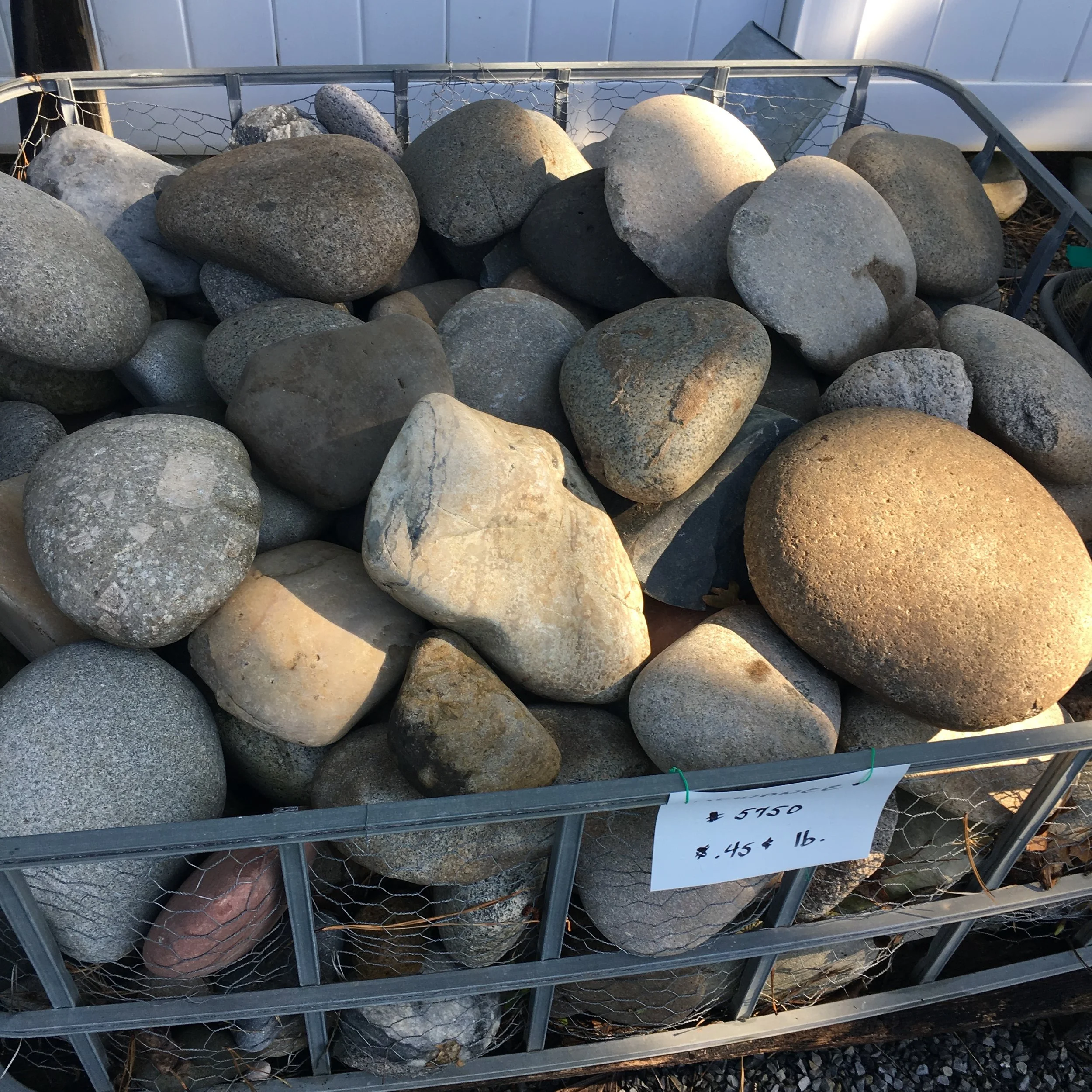 Hudson Valley River Rounds Tumbled river rounds with cooler colors. 4" to 5" across. Good for rock and water gardening and accents. Available by the yard